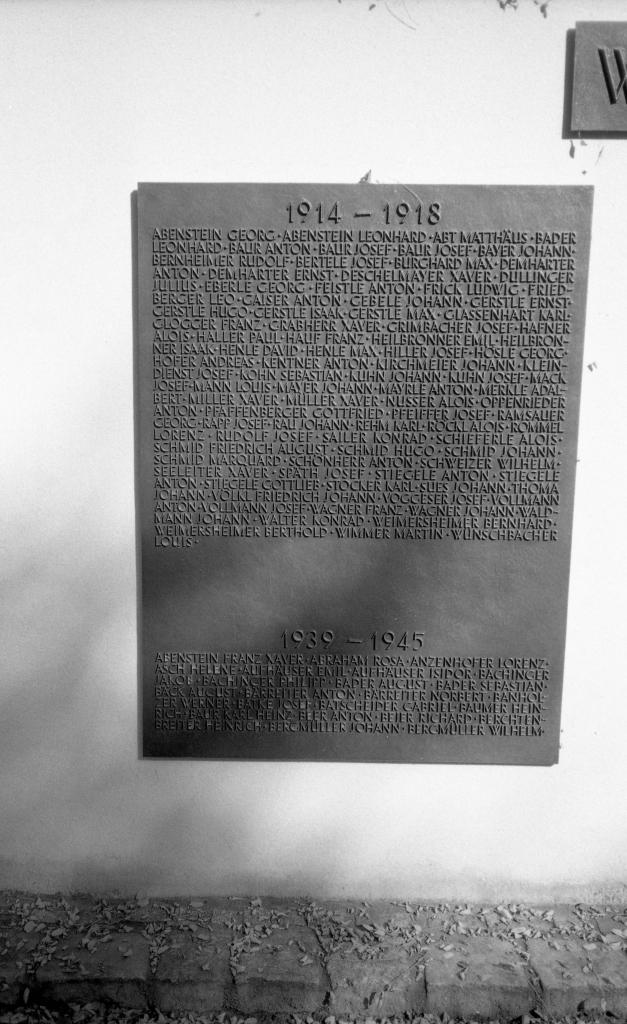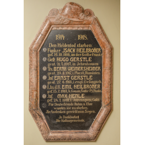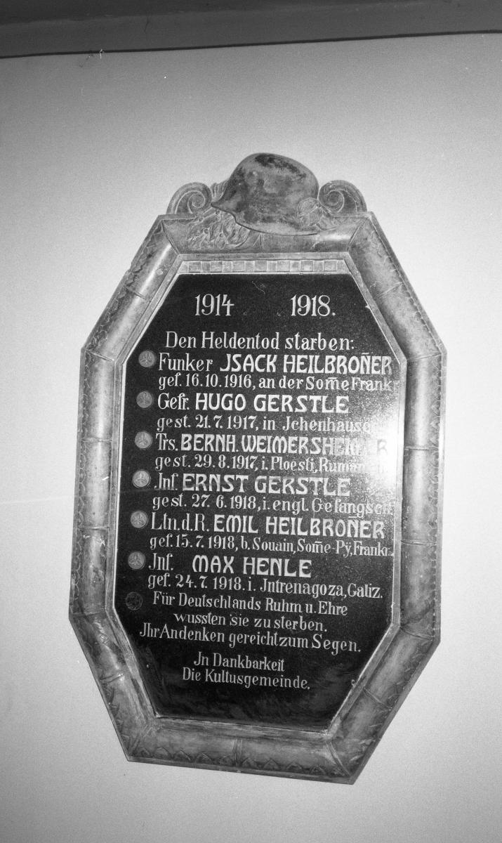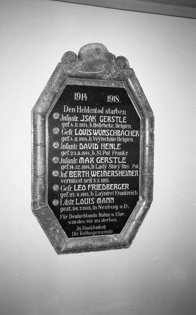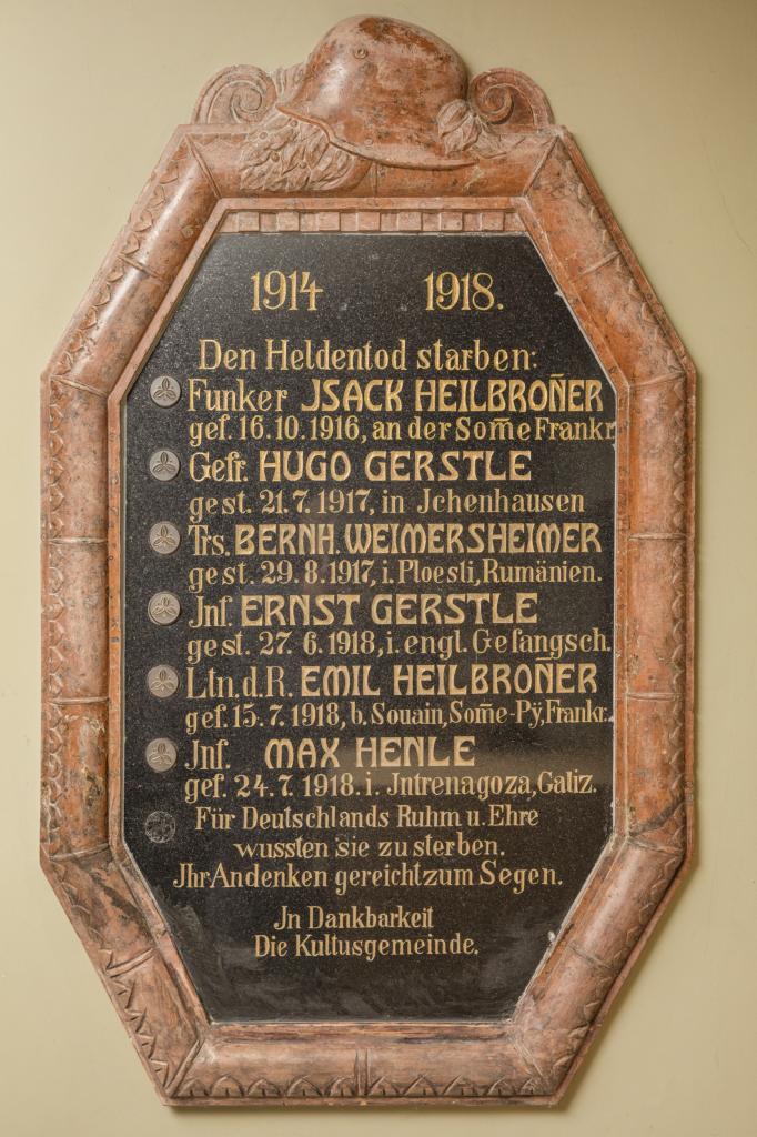 Im Eingangsbereich der heute als „Haus der Begegnung" genutzten ehemaligen Synagoge von Ichenhausen in der Vorderen Ostergasse 24 gibt es zwei Gedenktafeln für die jüdischen Gefallenen des Ortes, die die „Reichskristallnacht" überstanden haben. Auf der rechten sind unter einem Stahlhelm, den Zahlen 1914 1918 und der Überschrift Den Heldentod starben: die Namen und die weiterführenden Angaben der folgenden Gefallenen zu erkennen: