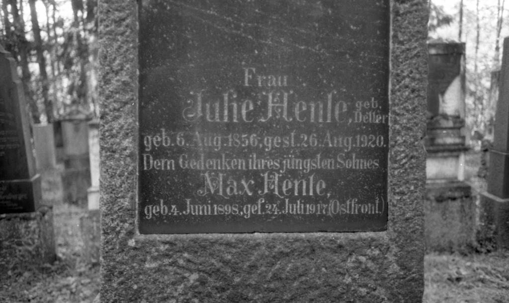 Auf dem untersten Abschnitt der Inschrift des Grabsteins von Frau JULIE HENLE, geb. DELLER, geb. 6.Aug. 1856, gest. 26. Aug. 1920 ist der Zusatz zu lesen: