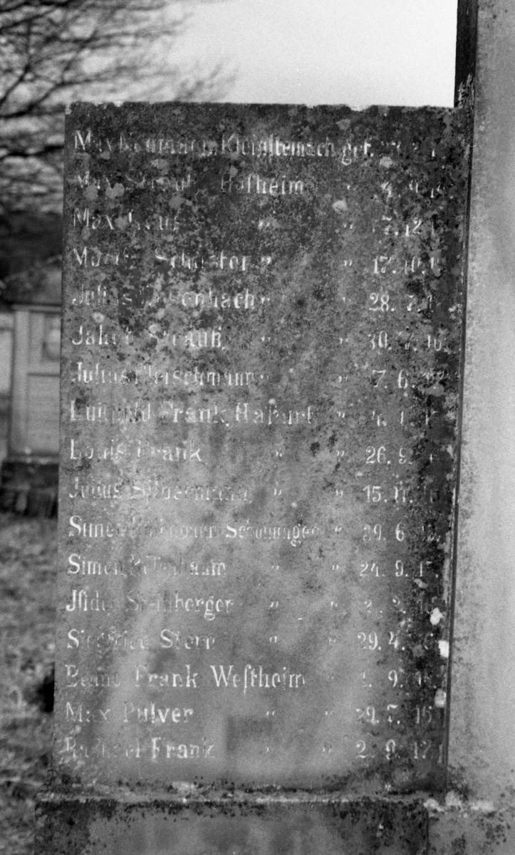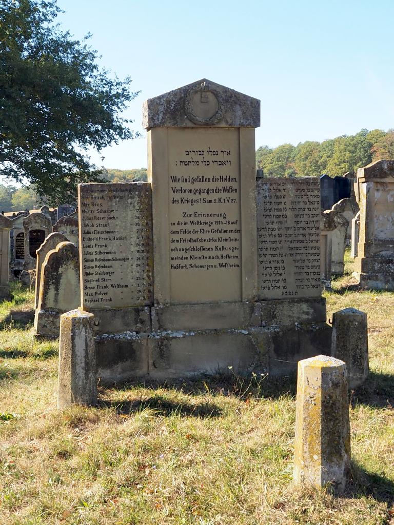 Wie sind gefallen die Helden, Verloren gegangen die Waffen des Krieges! Sam. 2.K.1.V.27 Zur Erinnerung an die im Weltkriege 1914–18 auf dem Felde der Ehre Gefallenen der dem Friedhofsbereich Kleinsteinach angeschlossenen Kultusgemeinden Kleinsteinach, Hofheim, Haßfurt, Schonungen und Westheim.