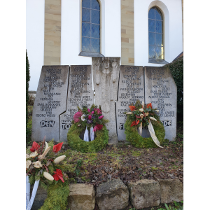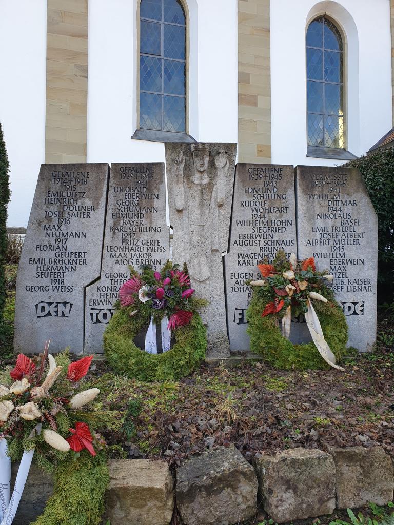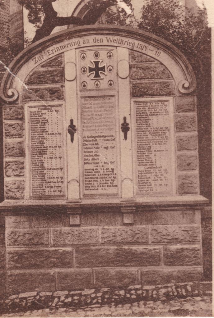 Unter der Überschrift GEFALLENE 1914 –1918 sind die Namen der Gefallenen des Ersten Weltkrieges aufgeführt, darunter auch der des jüdischen deutschen Soldaten 1916 MAX NEUMANN.