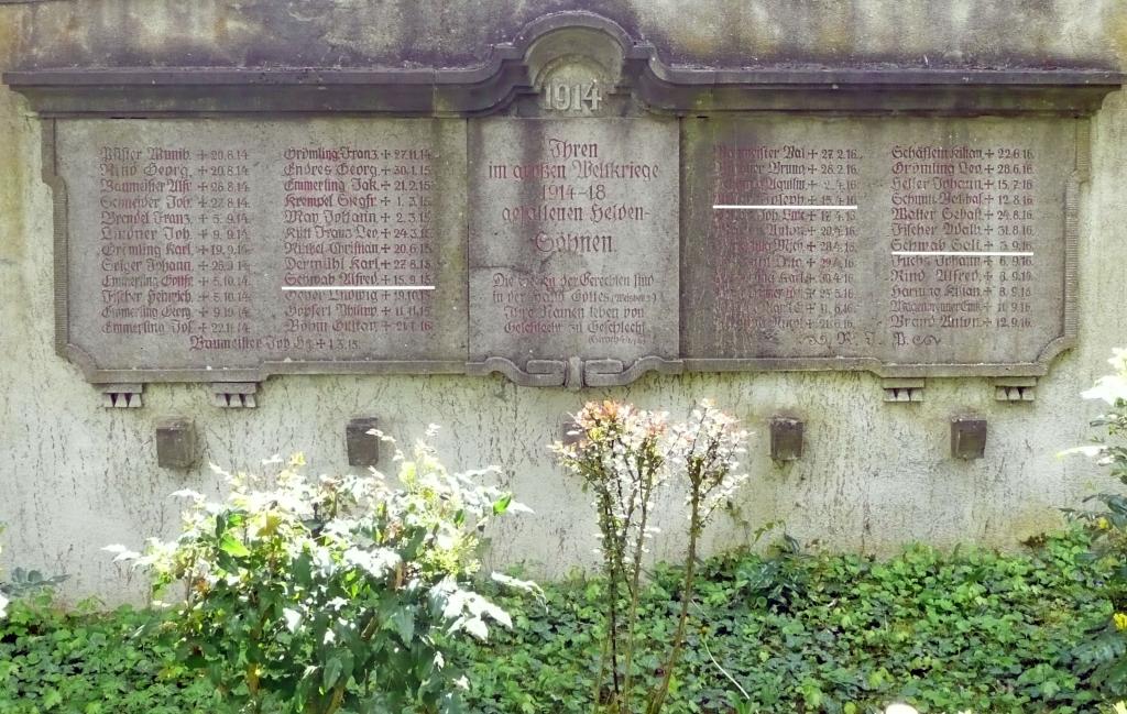 Ein weiteres großes Denkmal ist an der entgegengesetzten Mauer des Friedhofes vorhanden. In der Mitte der Gedenkstätte steht eine Figurengruppe, rechts und links davon sind Steinplatten mit den Namen der Gefallenen angebracht. Auf der linken Seite ist unter der Jahreszahl 1914 die folgende Überschrift zu lesen: Ihren im großen Weltkriege 1914–18 gefallenen Helden-Söhnen, auf der steht rechten unter der Jahreszahl 1918: Gewidmet dem ehrenden Andenken die dankbare Gemeinde Rimpar; unter beiden Inschriften sind die Namen der Gefallenen verewigt, auch die der folgenden jüdischen Soldaten: