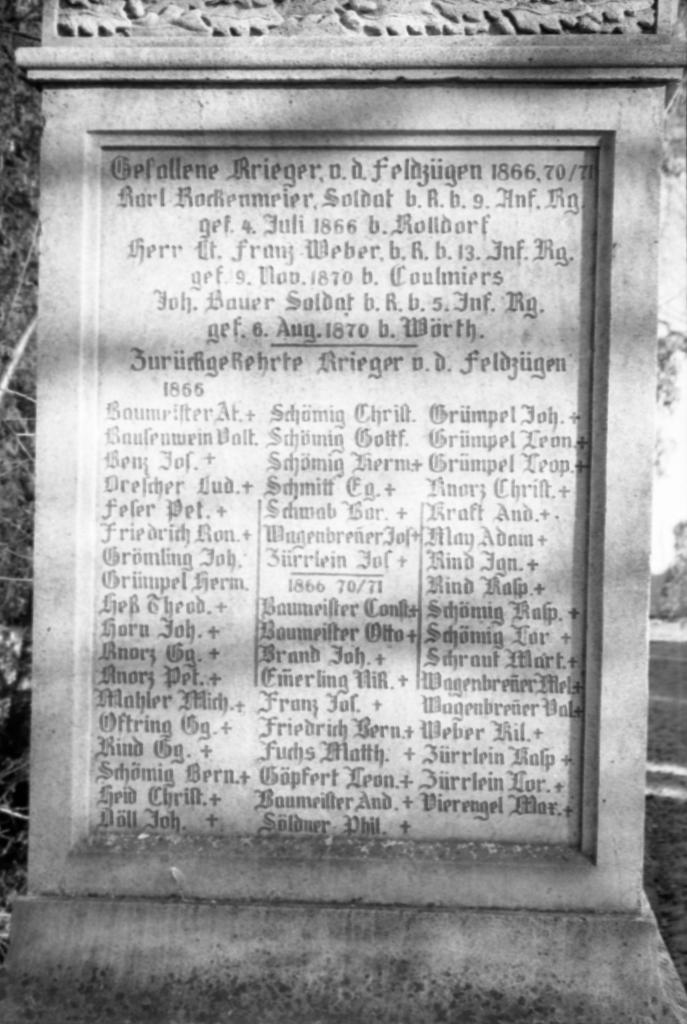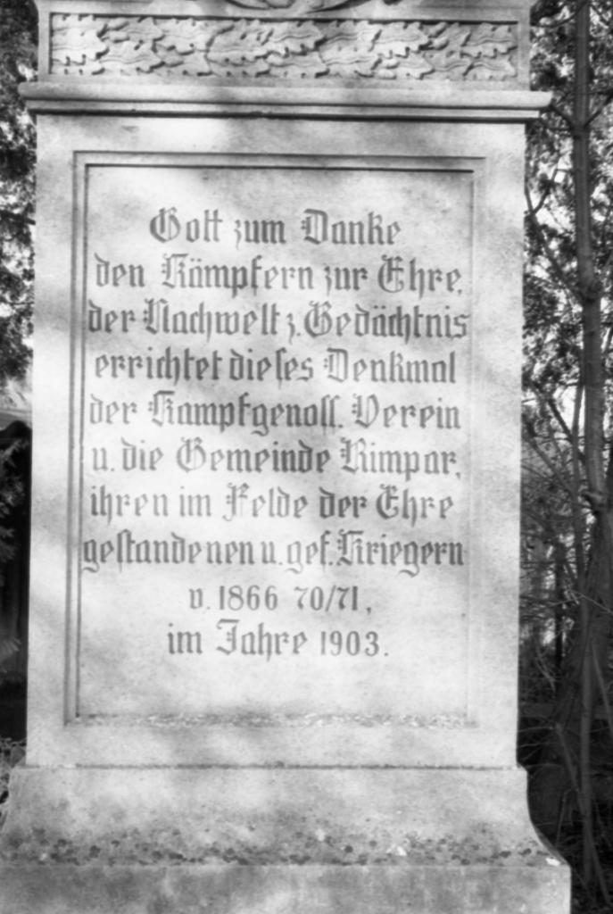 Gott zum Danke den Kämpfern zur Ehre der Nachwelt zum Gedächtnis errichtet dieses Denkmal der Kampfgenoss. Verein u. die Gemeinde Rimpar ihren im Felde der Ehre gestandenen und gef. Kriegern v. 1866 70/71 im Jahre 1903.