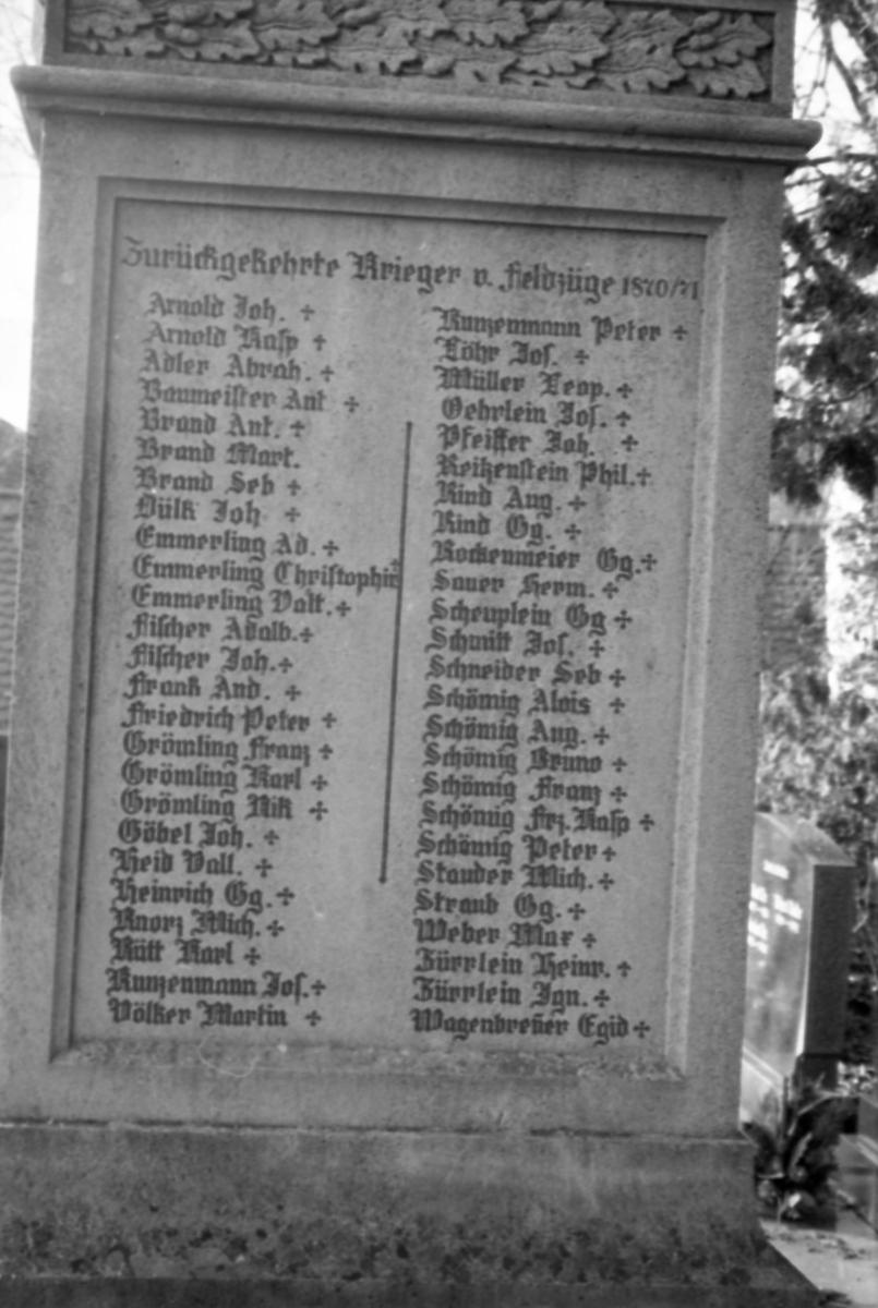 Auf der rechten Längsseite sind unter dem Titel Zurückgekehrte Krieger v. Feldzüge 1870/71 alphabetisch die Soldaten aus Rimpar aufgelistet, unter ihnen auch der jüdische Kriegsteilnehmer