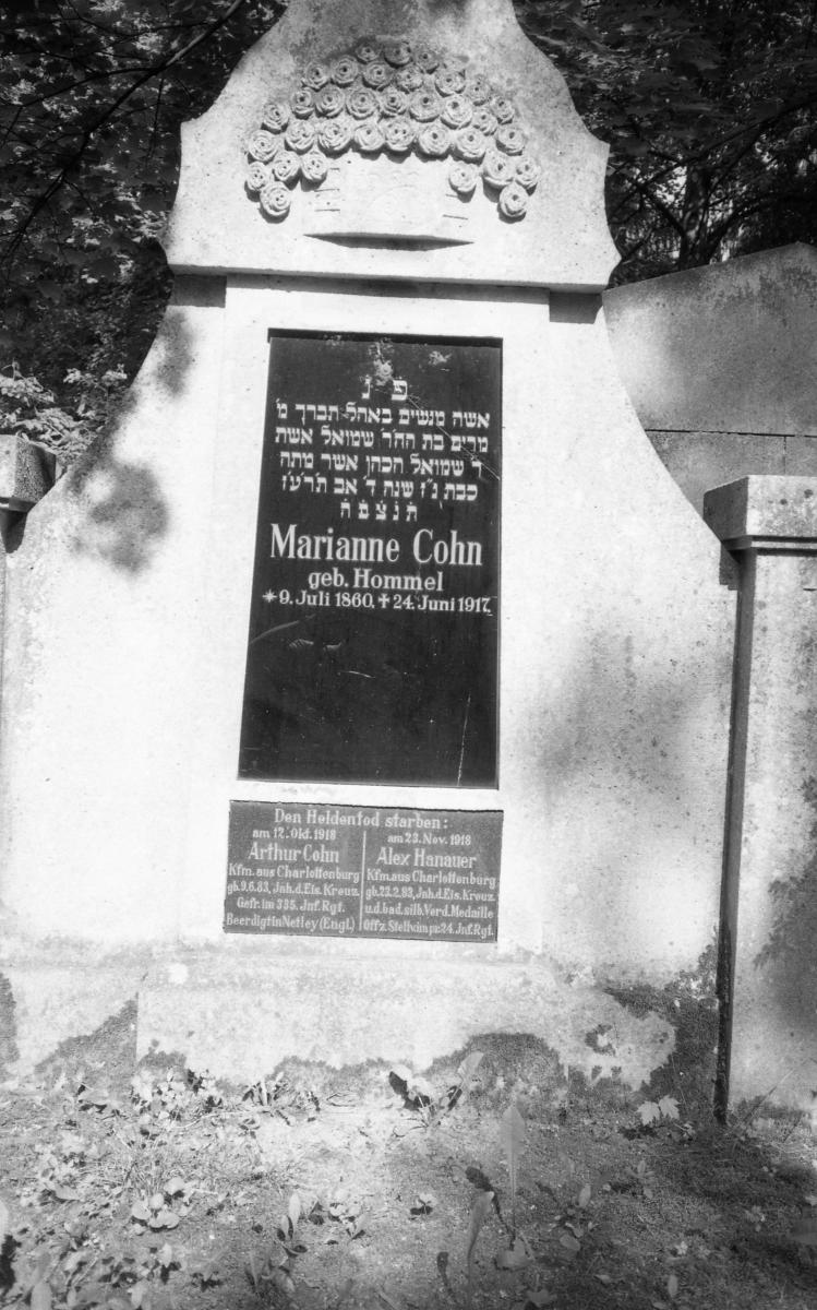 Auf dem unteren Teil des Grabsteins von Frau Marianne Cohn geb. Hommel, * 9. Juli 1860 24.Juni 1917 enthält eine Tafel folgende Inschrift: