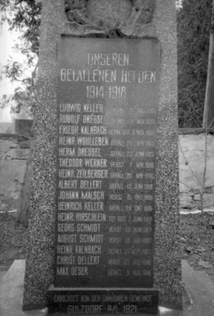 In Sulzdorf an der Lederhecke gibt es rechts vor dem Friedhof in einer kleinen Grünanlage ein dreiteiliges Kriegerdenkmal beider Weltkriege. Unter der Überschrift: UNSEREN GEFALLENEN HELDEN 1914 – 1818 sind im mittleren Denkmal die Namen der Bürger aus Sulzdorf a.d.L. aufgeführt, die nicht mehr aus dem Krieg zurückgekehrt sind, darunter auch der des jüdischen Soldaten: