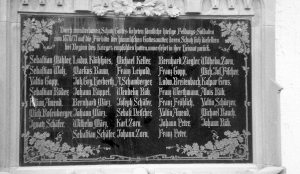 An der Südwand der kath. Pfarrkirche Mariä Himmelfahrt und St. Sebastian befindet sich ein Denkmal für die Teilnehmer des deutsch-französischen Krieges von 1870/71. Unter der Skulptur eines bayerischen Löwen und einem Eisernen Kreuz steht auf einer Tafel die Inschrift: Durch wunderbaren Schutz Gottes kehrten sämtliche hiesige Feldzugs-Soldaten von 1870/71 auf die Fürbitte der himmlischen Gottesmutter, deren Schutz sich dieselben bei Beginn des Krieges empfohlen hatten, unversehrt in ihre Heimat zurück. Unter den Namen der 38 heimgekehrten Feldzugsteilnehmer finden sich auch zwei jüdische bayerische Soldaten: