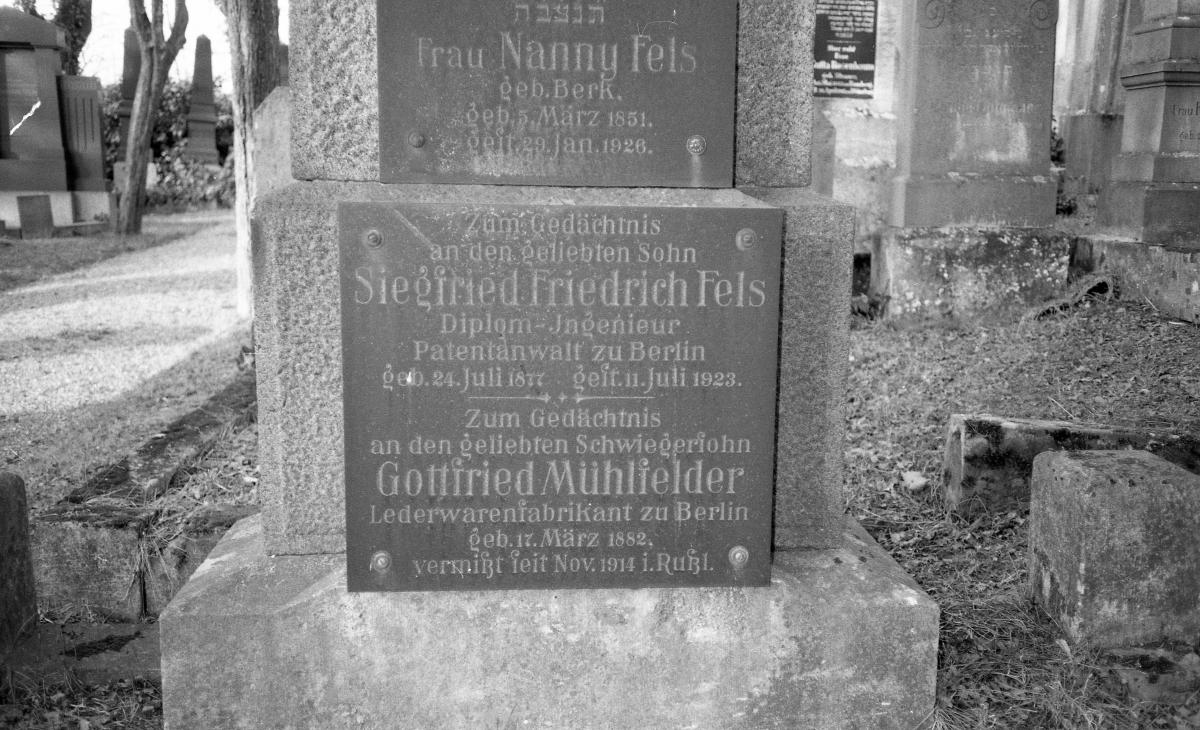 Unterhalb der Inschrift für Frau NANNY und Herrn JOSEPH FELS s.A. kann man auf deren Familiengrab die folgende Gedenktafel lesen: