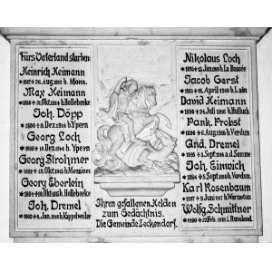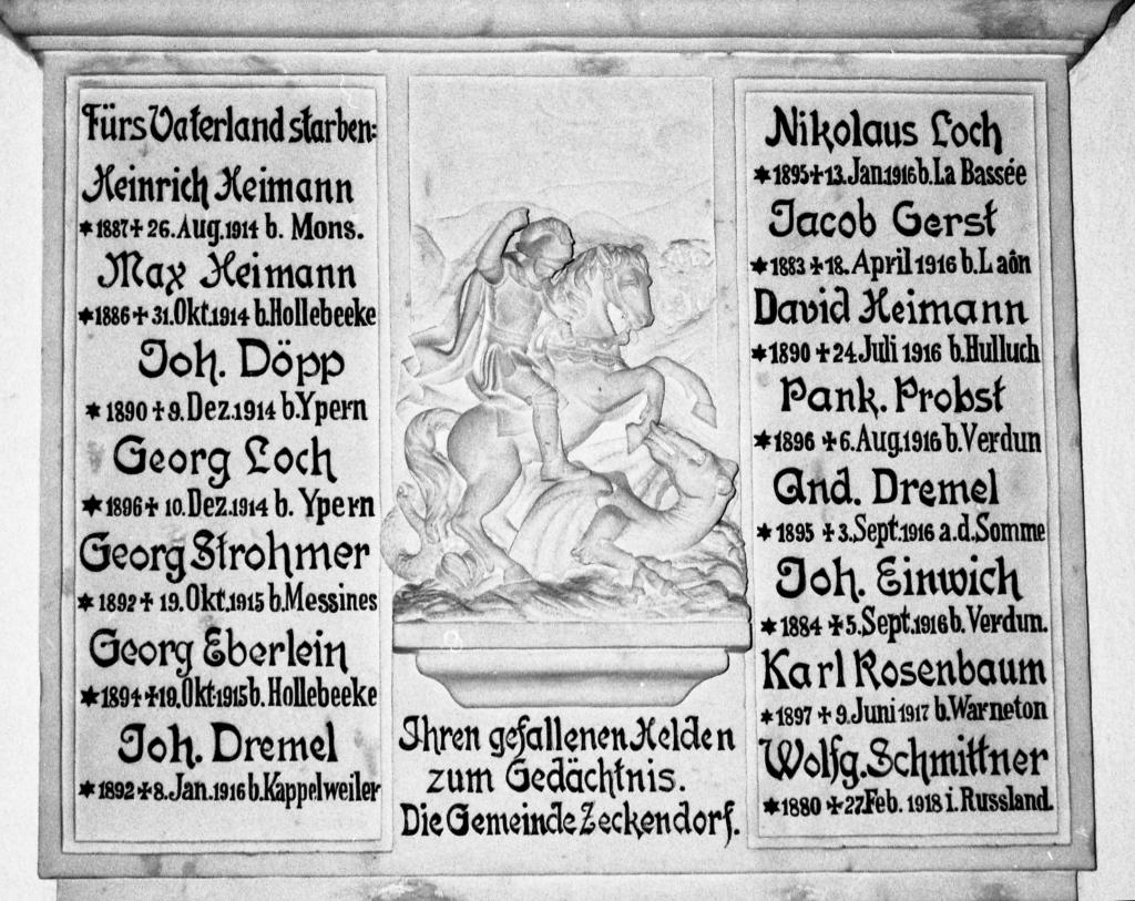 Unter einem Eisernen Kreuz mit den Jahreszahlen 1914 1918 und der Widmung Fürs Vaterland starben ist eine Skulptur zu sehen. Rechts und links davon sind auf Tafeln die Namen der Gefallenen von Zeckendorf verewigt, darunter auch die der folgenden jüdischen deutschen Soldaten