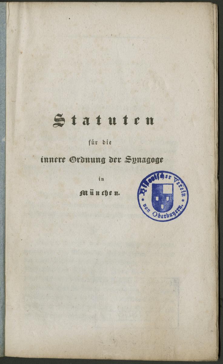Administration des Israelitischen Cultus (Hg.): Statuten für die innere Ordnung der Synagoge in München. Durch Regierungs-Rescript vom 12. Juni 1825 genehmigt. München (Hofdruckerei Lindauer) 1826. Stadtarchiv München, Ver-Bibl-31999.