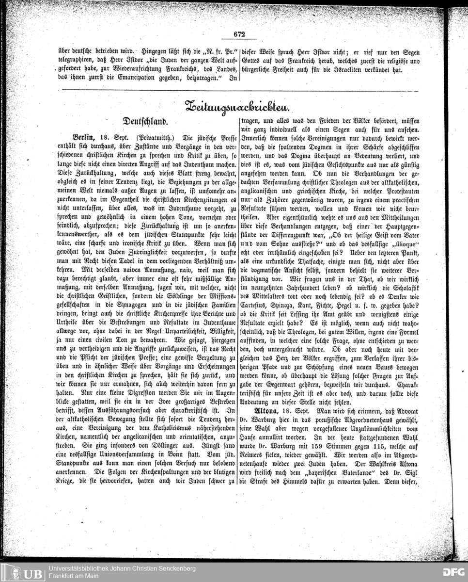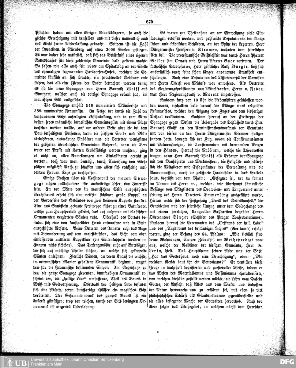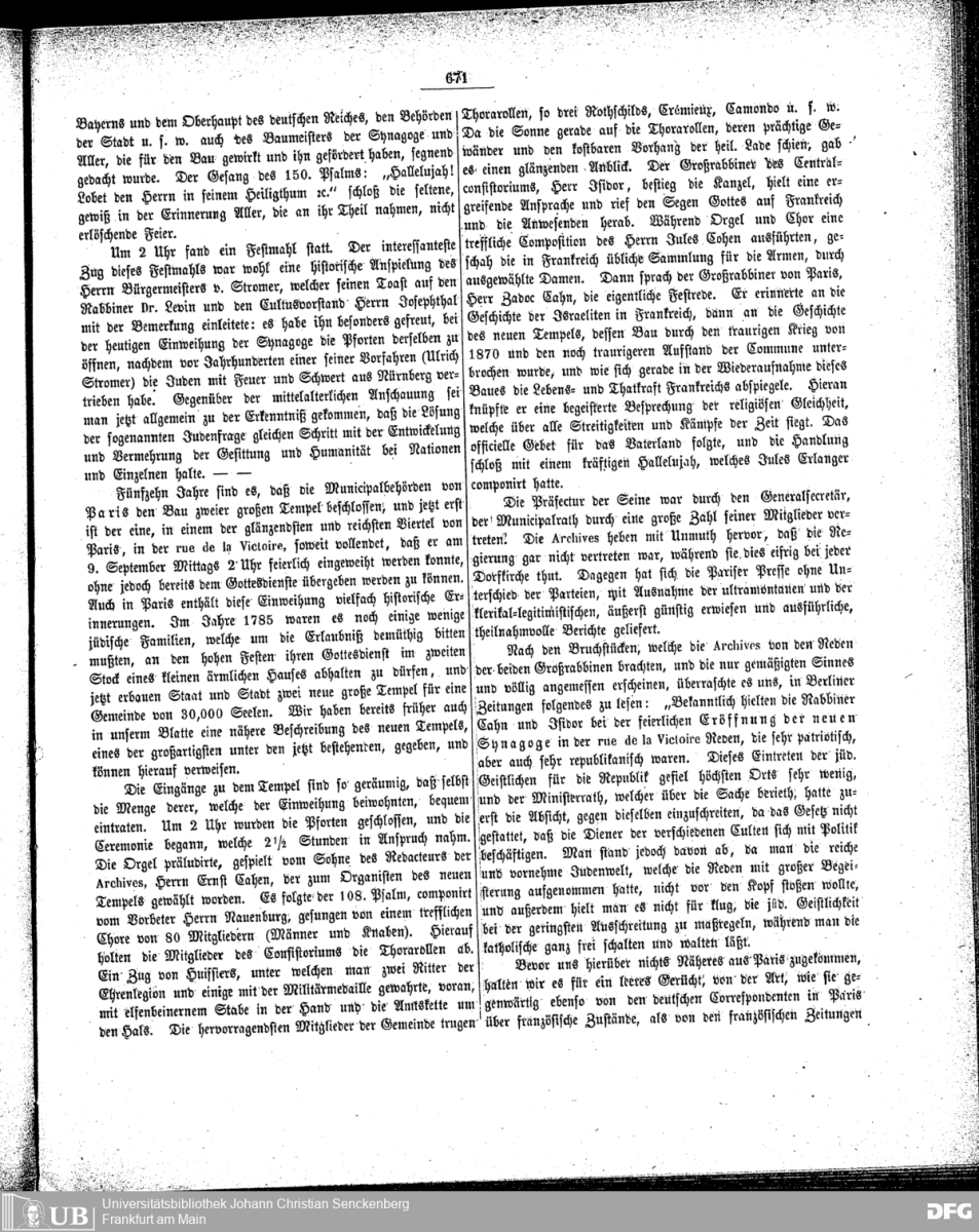Die Einweihung zweier neuer großer Tempel in Nürnberg und Paris [am 8./9. September 1874]. In: Allgemeine Zeitung des Judenthums, Jg. 38 Nr. 40 (29. September 1874), S. 669-672. Universitätsbibliothek J.C. Senckenberg Frankfurt am Main – Compact Memory.