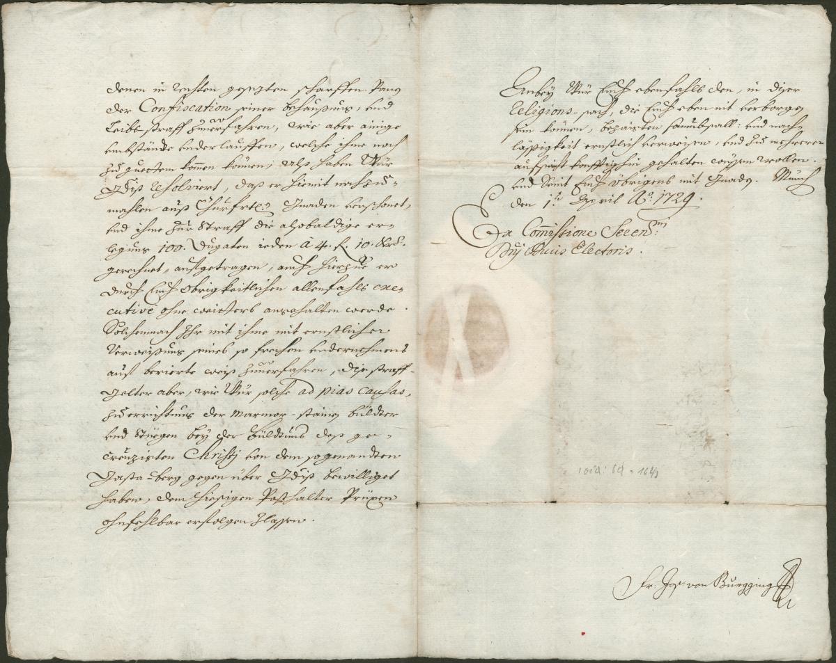 [Seite 3] Anbey Wür Euch ebenfahls den, in dieser Religionssach, die Euch eben nit verborgen sein können, bezaigten Saumbsall vnd Nachlässigkeit ernstlich verweisen, vnd zu mehrerer Aufsicht konfftighin gehalten wüssen wollen. Vnd seint Euch übrigens mit Gnaden. München den 1ten April Ao 1729.