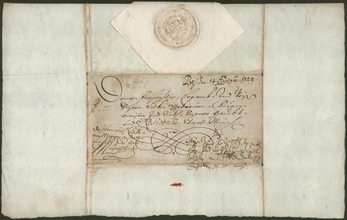 [Anschrift] Denen fürsichtig, ersamb vnd weisen, vnsern lieben getreuen, Burgermeister vnd Rath vnserer Haubt- vnd Residenz-Statt München. [Aktennotiz in anderer Handschrift] Praes: den 14. Apr. Ao. 1729. Den Weinwirth Hillebrandt wegen Gestattung der Juden Festivitet betr. / Sign: seye zum lobl. Gt der Publicier- vnd Vollziehung willen zu geben. Concl. et sign. Mandato D. D. Consulen den 15. eiusd: