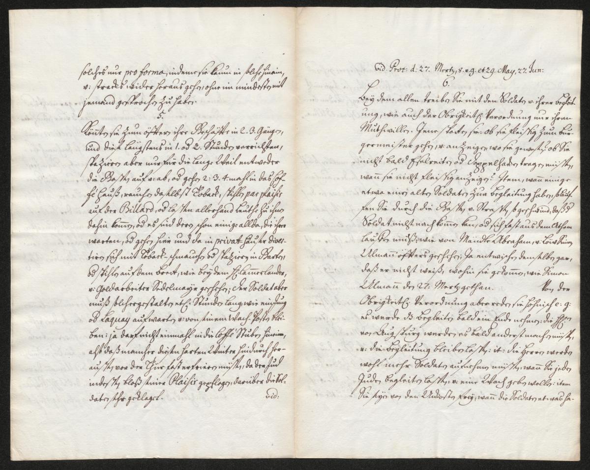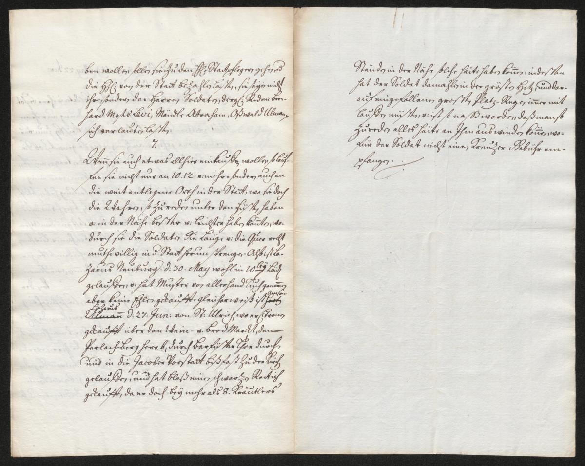 Sechstens: Bei alledem treiben sie mit den Soldaten und ihrer Begleitung wie auch mit der Obrigkeitlichen Verordnung nur ihren Mutwillen. Jene verspotten sie: „Ob sie fleißig zum Bürgermeister gehen und anzeigen, wo sie gewesen seien? Ob sie nicht bald Esel reiten oder Doppelhacken tragen müssen, wenn sie nicht fleißig anzeigen?“ Ebenso, wenn einige etwa einen alten Soldaten als Begleitung haben, so laufen sie so schnell durch die Gassen und Straßen, dass der Soldat nicht nachkommt, oder sich fast aus dem Atem laufen muss, wie es von Mändle Abraham und Löw Simon Ullmann öfter geschehen ist. Ja sie entkamen dem Soldaten sogar, dass er nicht weiß, wohin sie gegangen sind, wie Simon Ullmann es am 27. März getan hat. Von der Obrigkeitlichen Verordnung aber reden sie höhnisch, zum Beispiel, es werde das Begleiten bald ein Ende nehmen, die Herren von Augsburg würden es bald anders machen müssen und die Begleitung bleiben lassen. Ebenso: die Herren würden wohl mehr Soldaten aufnehmen müssen, wenn sie jeden Juden begleiten lassen und ihm eine Wache geben wollten. Ebenso: sie seien von den Gebühren frei; wenn die Soldaten etwas haben wollten, sollten sie zu den Herren Stadtpflegern gehen, oder die Herren von der Stadt bezahlen lassen; sie seien nicht ihre Soldaten, sondern die der Herren. Derartige Reden lassen Bernhard Moses Levi, Mändle Abraham, Oswald Ullmann usw. verlauten.