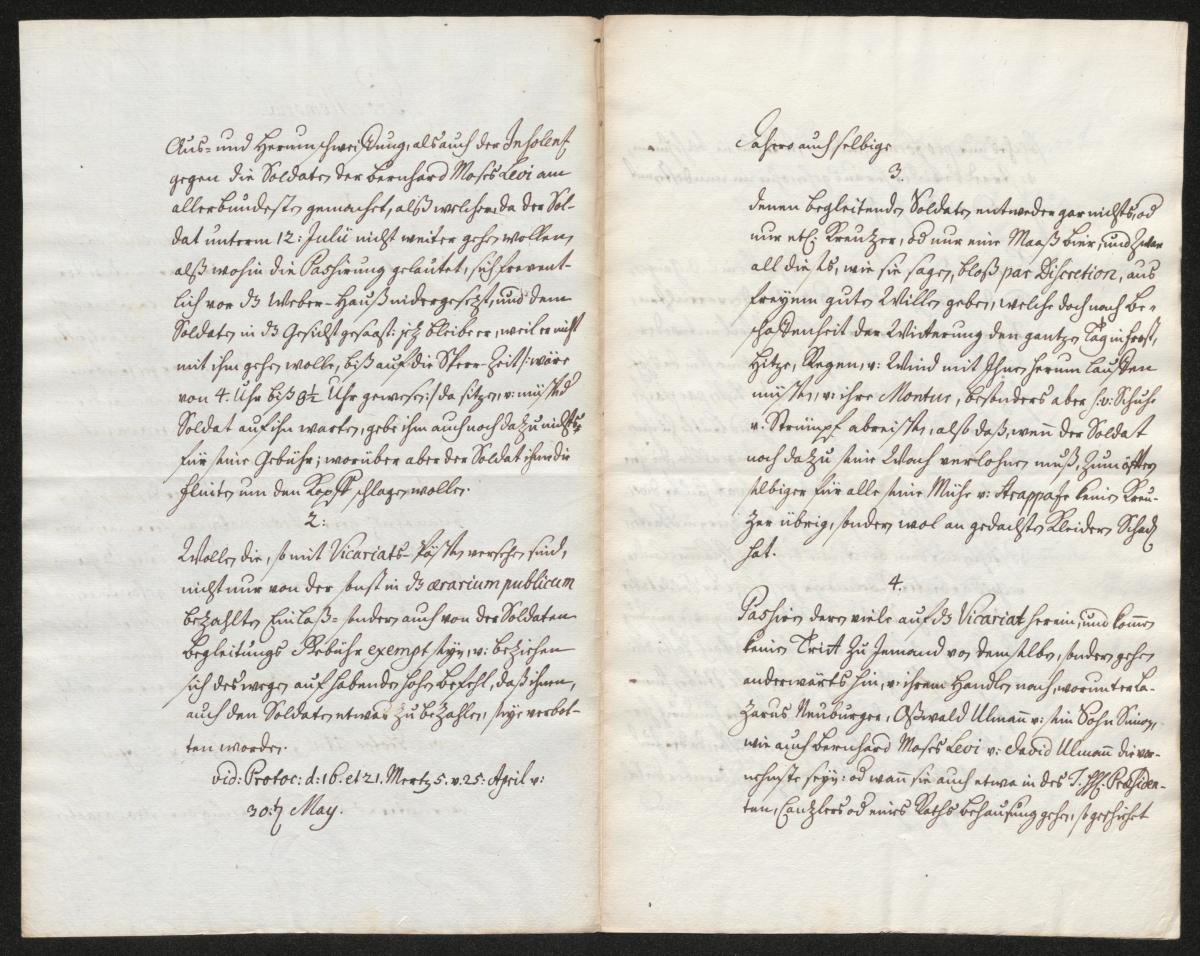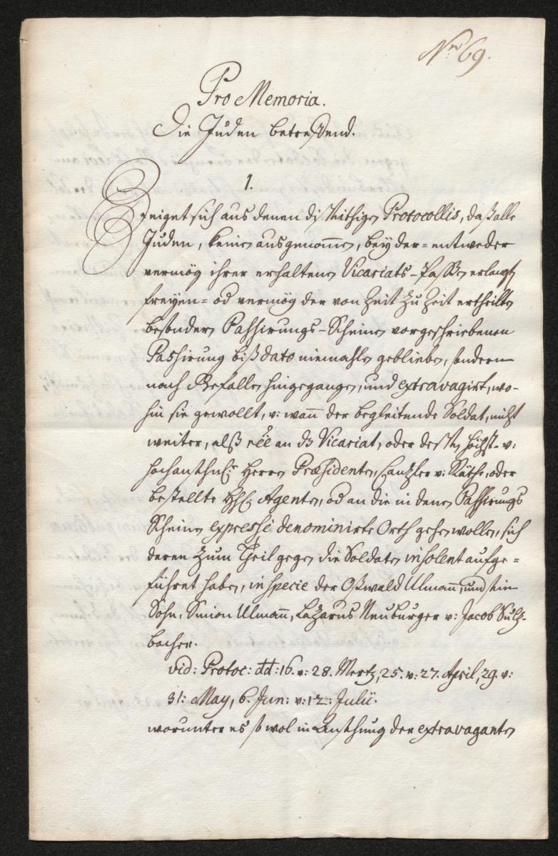 [...] Erstens ist aus den Seiten dieses Protokolls zu entnehmen, dass alle Juden ohne Ausnahme bisher nie bei ihrem - entweder durch ihre Vikariats-Pässe erlangten freien - oder durch die zeitlich begrenzten besonderen Passierungs-Scheine vorgeschriebenen Aufenthalt blieben, sondern nach Belieben hingingen und sich herumtrieben, wo sie wollten. Wenn der begleitende Soldat [des Stadtmilitärs] nicht weiter als bis zum Vikariat oder zu dessen höchst- und hochansehnlichen Herren Präsidenten, Kanzlern und Räten oder bestellten Agenten oder an die in ihren Passierungs-Scheinen ausdrücklich genannten Orte gehen wollte, so hätten sie sich zum Teil gegenüber den Soldaten unverschämt aufgeführt, insbesondere Oswald Ullmann und sein Sohn Simon Ullmann, Lazarus Neuburger und Jakob Sulzbacher,