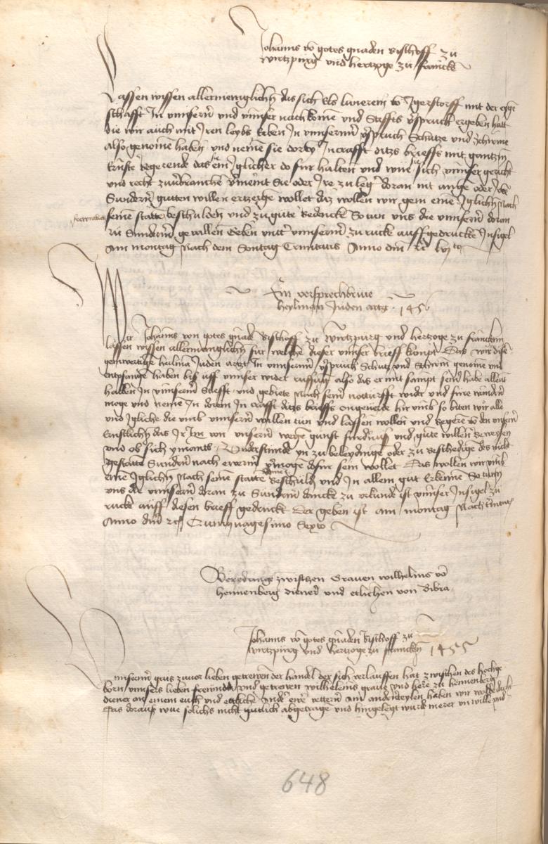 Bischöflicher Schutz- und Geleitbrief (Salva Guardia) für den jüdischen Arzt Heilman, 24. Mai 1456. Abschrift aus einem Kopialbuch, 15. Jahrhundert. Staatsarchiv Würzburg, Liber diversarum formarum 12, S. 648.