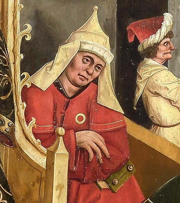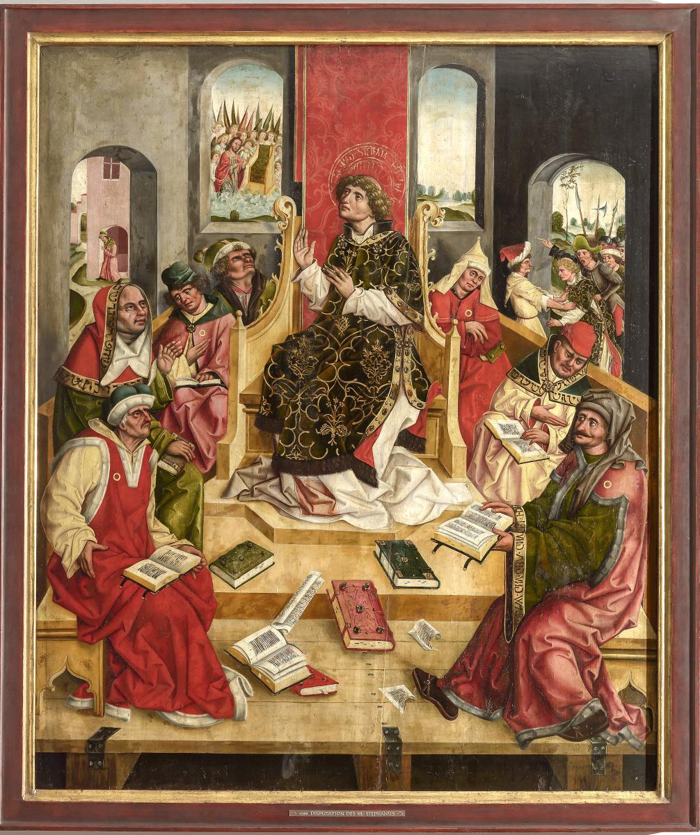 Disputation des hl. Stephanus. Aus dem Hochaltarretabel der Benediktiner-Klosterkirche Weihenstephan in Freising. Mischtechnik auf Fichtenholz. Jan Polack, München um 1483-89. Bayerische Staatsgemäldesammlungen, Inv. 1396.