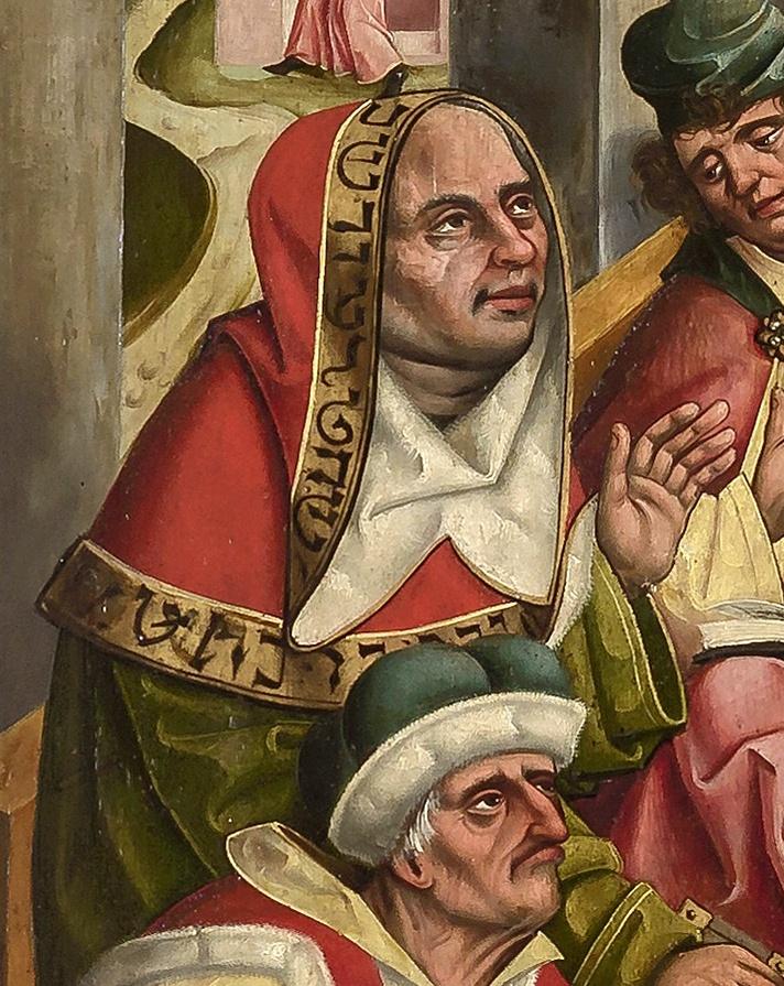 Stephanus wird von jüdischen Schriftgelehrten eingerahmt, deren körperliche Nähe und teils aggressive Mimik bedrohlich wirkt. Ledergebundene Bücher und zerknüllte Notizzettel bilden einen Wall um den Heiligen: Während jener frei spricht, gestützt auf seine Visionserfahrung, berufen sich die Gelehrten auf ihre Religionsgesetze. Dies ist ein Hinweis auf den Vorwurf der Kirche gegenüber Juden, dass diese wegen ihres Festhaltens am buchstabengetreuen Glauben den Bund mit Christus verweigerten. Die Schriftgelehrten tragen mehrheitlich fahlgelbe Unterkleider, fünf dazu noch ein rotes oder fahlrotes Gewand. Mit dieser Farbkombination werden sie von Jan Polack als heimtückische Gegner diffamiert, die bereits auf den Märtyrertod von Stephanus hinarbeiten. Der Gelbe Ring ist deutlich an der Kleidung zu sehen und kennzeichnet die Träger als Juden. Zwei der sitzenden Schriftgelehrten bilden mit Stephanus eine horizontale Blickachse. Ihre Gewänder sind mit zahlreichen, formal korrekten, aber in keinem sinnvollen Zusammenhang stehenden hebräischen Buchstaben verziert. Der Maler Jan Polack hatte wohl Vorlagen kopiert, ohne sie zu verstehen oder übersetzen zu können.