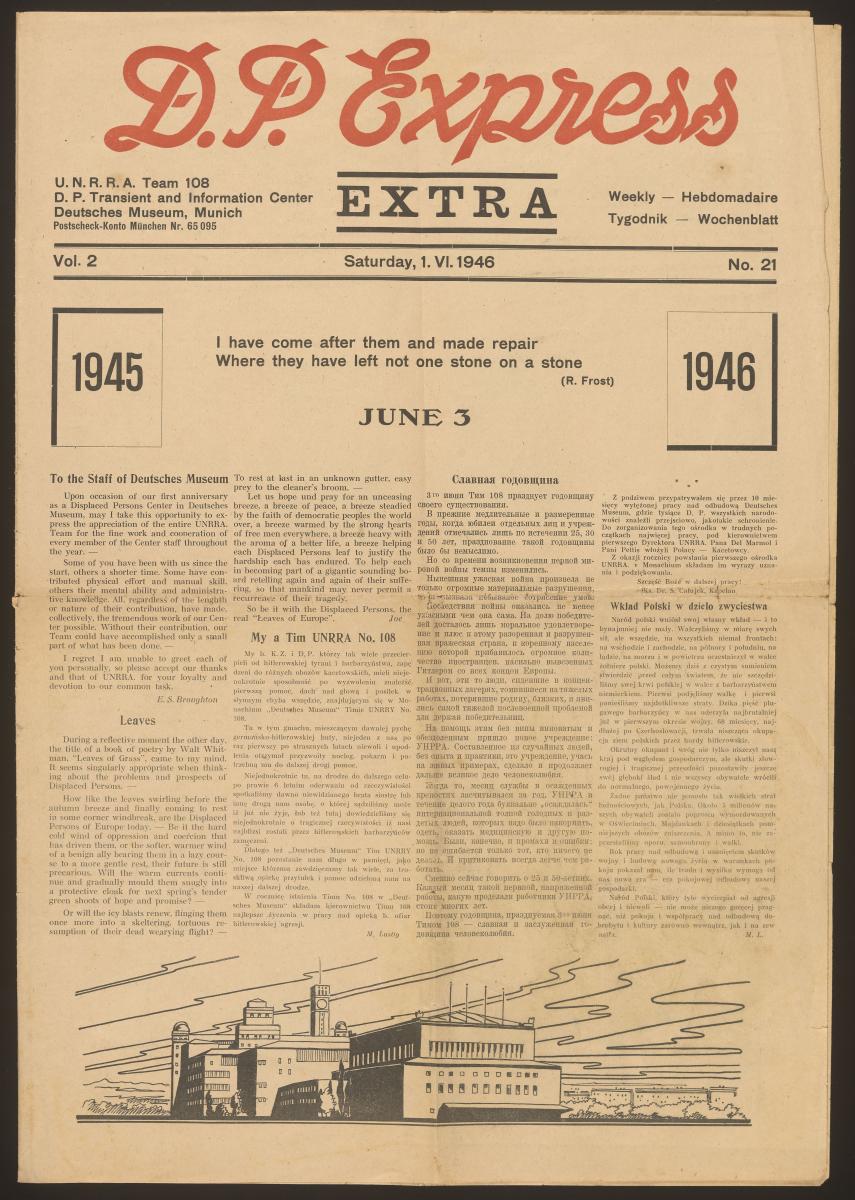 Extrablatt der mehrsprachigen Wochenzeitschrift "D.P. Express", 2. Jg. Nr. 21 (1. Juni 1946). Herausgegeben vom UNRRA Team 108 und dem DP Transient und Information Center im Deutschen Museum, München. United States Holocaust Memorial Museum, Samuel Zisman Papers 7-3.