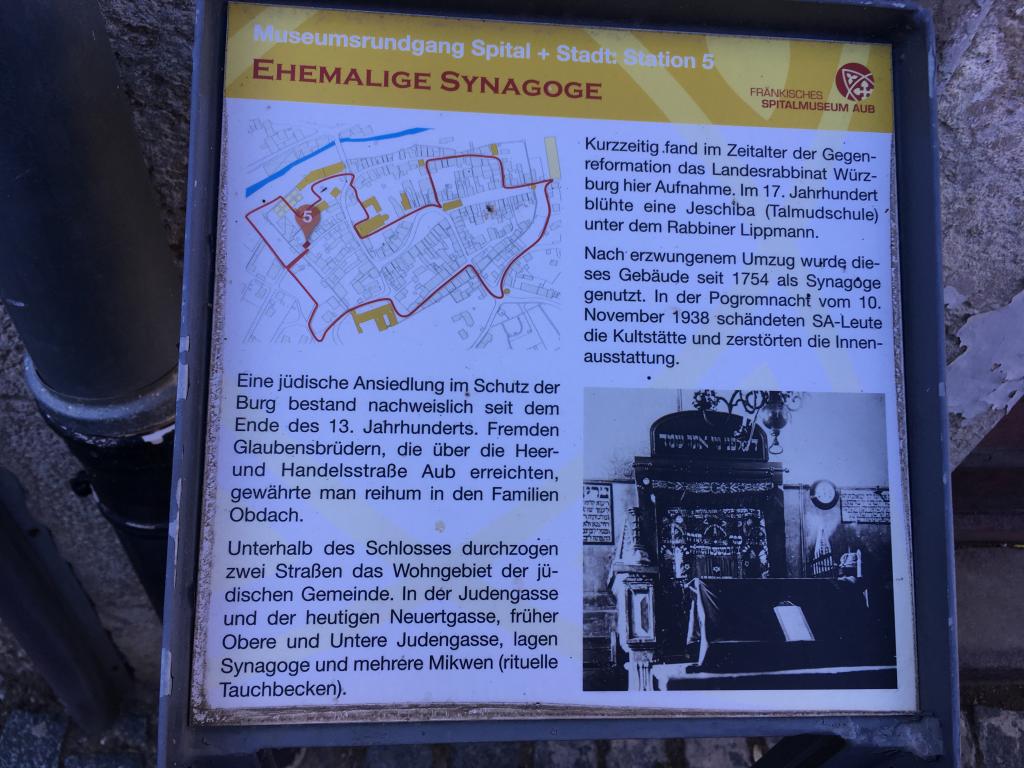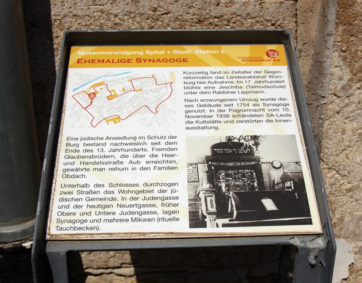 Das Synagogengebäude in der Neuertgasse 12 blieb erhalten. Nach verschiedenen Umbauten, bei denen u.a. der zweigeschossige Betsaal eine Zwischendecke erhielt, wurde es bis 2013 als Wohnhaus verwendet. Das Gebäude ist die 5. Station im historischen Rundgang "Spital & Stadt" des Spitalmuseums Aub, vor dem Eingang mit Spuren einer Mesusa steht eine illustrierte Informationstafel.
