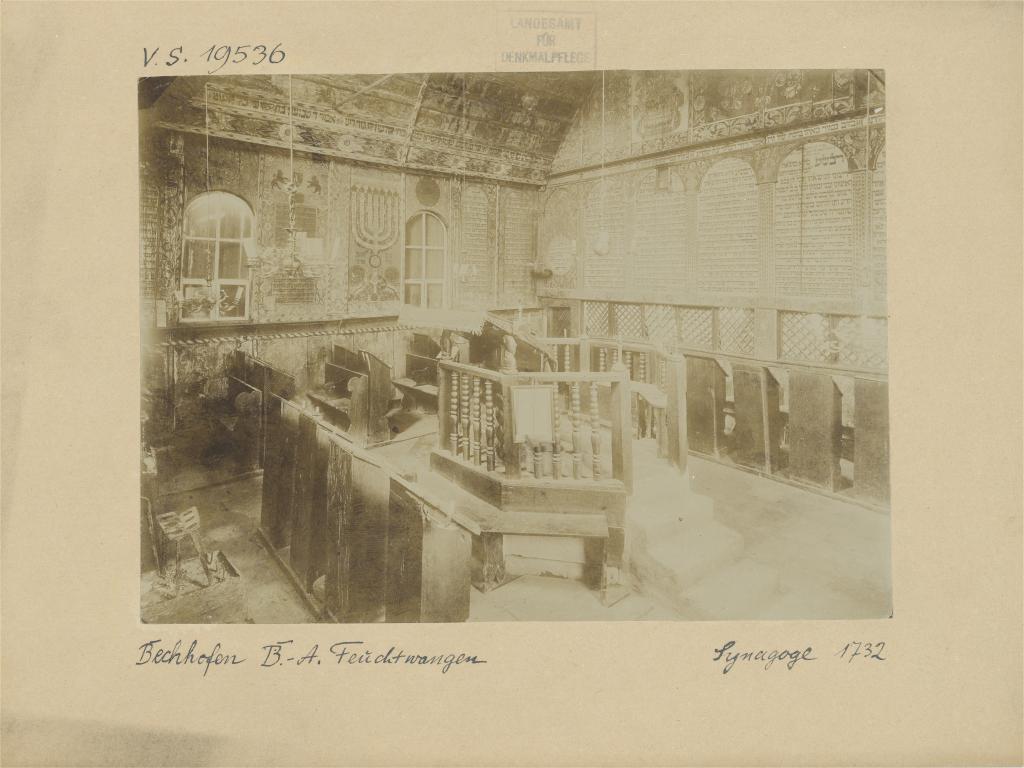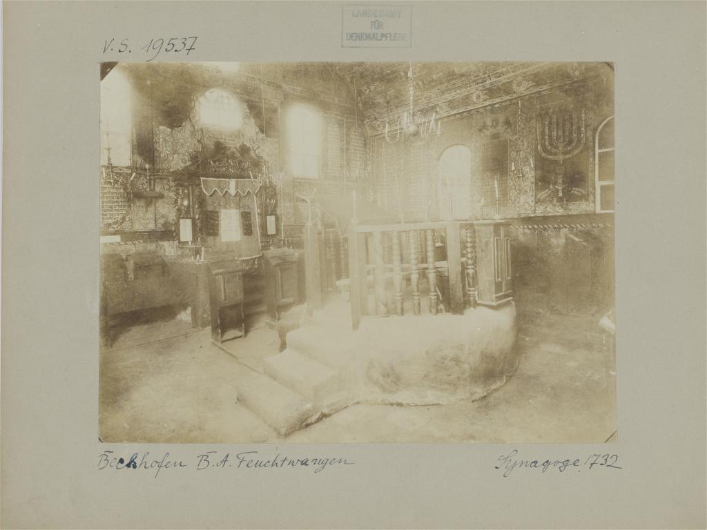 Die frühe Kultusgemeinde besaß bereits vor dem Dreißigjährigen Krieg eine „feine Juden Schul“, die durch eine brandschatzende Soldateska „allda ruinieret worden“ ist. Über den Standort oder das Aussehen dieser ersten Synagoge ist nichts bekannt, auch ist unklar ob sich die Gemeinde danach in einem halb zerstörtem Gebäude oder einem privatem Betraum versammelte. Für die verarmten Bechhofer Juden war es jedenfalls zunächst dringlicher, ihren Familien wieder ein Heim und Auskommen zu schaffen. Als sich die Lage langsam besserte und ihre Zahl beständig anwuchs – 1681 stellten Juden fast ein Drittel der 230 Einwohner – wandte sich der Vorstand mit einer Bittschrift an Markgraf Johann Friedrich III. von Brandenburg-Ansbach (reg. 1667-1686), um die Genehmigung für einen Synagogen-Neubau einzuholen.