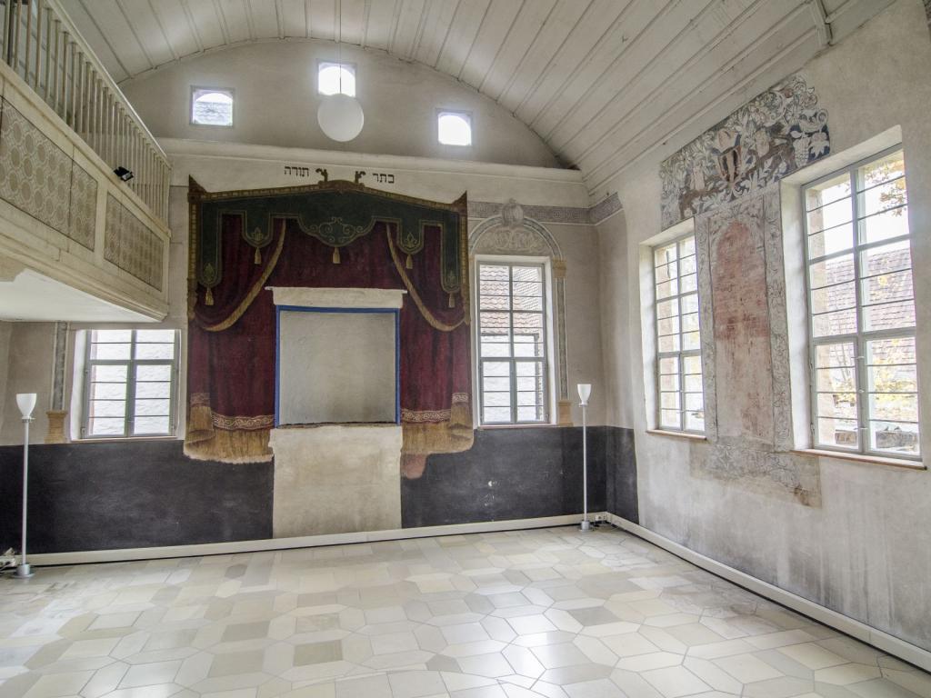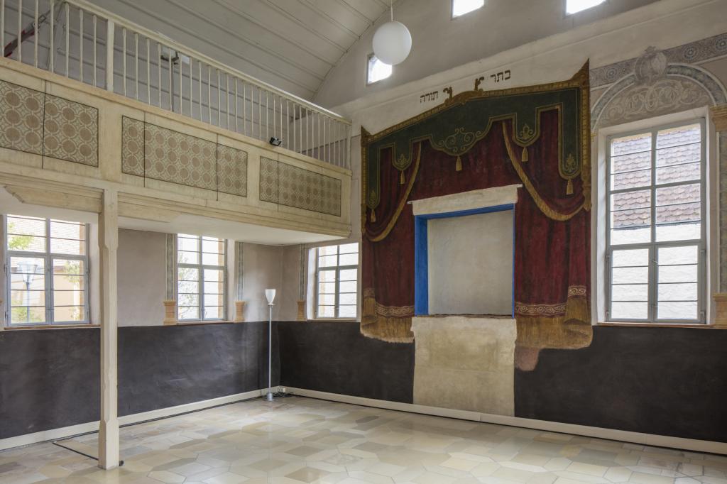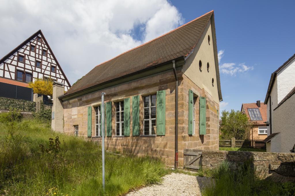 Am 10. April 1729 stellte die Gemeinde beim Oberamt Roth den Antrag, eine neue Synagoge mit Lehrerwohnung errichten zu dürfen. Sie hatte dafür ein entsprechendes Grundstück am Talbuck erworben (heute Am Anger 9). Durch die Vermittlung des Schwabacher Vorstehers Mose Benjamin Neuburger genehmigte die Ansbacher Regierung am 23. Februar 1733 das Bauvorhaben; Neuburger half auch bei der Finanzierung und gewann selbst weitere Stifter. Ihm ist daher der erste Eintrag im Georgensgmünder Memorbuch gewidmet. Die markgräfliche Erlaubnis hatte jedoch die Einschränkung, dass besonders in amtlichen Schriftstücken nicht von einer "Synagog" die Rede sein durfte, sondern nur von einer "Judenschul". Entsprechend neutral wurde ein schlichtes Gebäude aus regionalem Sandstein und verputztem Fachwerk errichtet. Mithilfe des hebräischen Psalms 118,19 auf dem Türsturz des Eingangs kann der Rohbau genau datiert werden, denn er enthält als Chronogramm die Jahreszahl (5)494, nach christlicher Zeitrechnung 1733/34. Eingeweiht wurde die Synagoge 1735. Dies dürfte damit zusammenhängen, dass die Synagoge im Inneren zunächst noch mit aufwändigen Wandmalereien ausgestattet wurde, die dem galizischen Synagogenmaler Elieser Sussmann zugerechnet werden. Sussmann arbeitete zu dieser Zeit in der Gegend und in seinem nachprüfbaren Schaffen klafft eine Lücke, die genau zum Entstehungszeitraum der Georgensgmünder Synagoge passt. Außerdem entsprechen die verwendeten Farben und die Motive Sussmanns Stil. In Georgensgmünd bemalte er keinen Untergrund aus Holz, sondern malte direkt auf den Wandputz. Erst bei der großen Sanierung im Jahr 1988 stieß man unter mehreren Schichten Wandfarbe auf diese Schätze. Im Norden des Gebäudes schließen sich zwei kleinere Räume an. Einer davon ist heute Vorraum und Treppenhaus sowohl nach oben zur Frauenempore als auch in den Keller zum ursprünglichen Ritualbad, das 1829 aufgeben wurde. Im zweiten Raum baute man die neue Mikwe ein, die den staatlichen Hygienevorschriften entsprach. Dank einer gelungenen Rekonstruktion sind heute in Georgensgmünd sowohl die alte, als auch die neue Mikwe zu besichtigen. Eine erhaltene quadratische Öffnung zur Synagoge diente als Durchreiche, an der Neugeborene dem Beschneider übergeben wurden. Die Frauenabteilung lag im Obergeschoss auf der Haupt- und Nebenempore, gegenüber lag der Zugang zur Lehrerwohnung. Die Sicht für die Frauen von den Emporen herab war durch die geringe Tiefe des Saals stark eingeschränkt: Der Gottesdienst blieb wohl ein eher akustisches Erlebnis.
