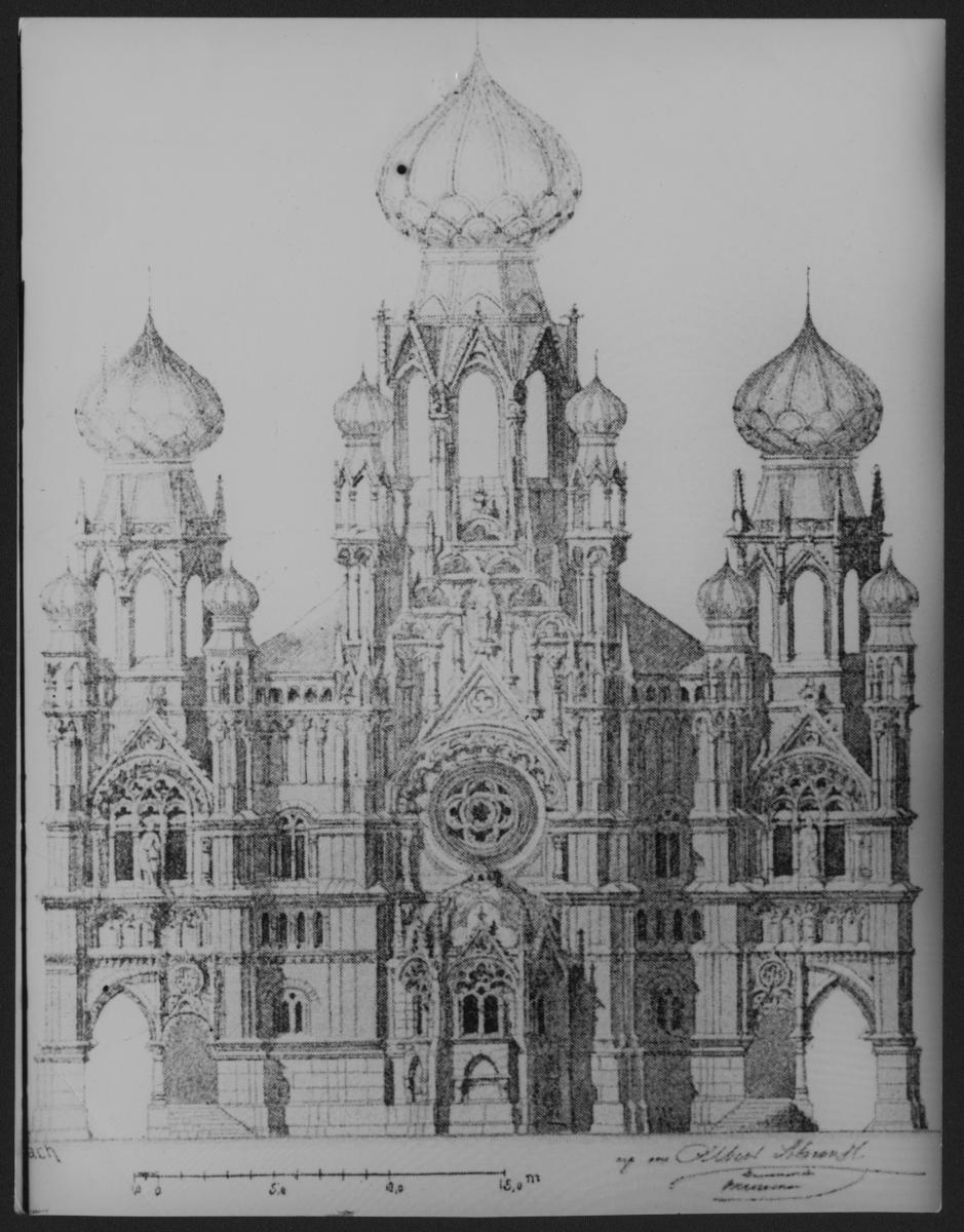 Die repräsentative, nach Osten weisende Hauptfassade beinhaltete nach Schmidts Plänen eine prächtige Toranische und eine gotische Rosette als Misrachfenster. Allerdings untersagten die Behörden aus polizeilichen Gründen das Vorhaben, weil die große Synagoge zu dicht an umgebenden Gebäude angegrenzt hätte - wahrscheinlich waren aber antijüdische Ressentiments der Anwohner für die Ablehnung ausschlaggebend. Nicht realisiert wurden auch die Pläne der Architekten Albert Schmidt und Matthias Berger für einen Neubau auf dem erweiterten Grundstück der alten Synagoge.