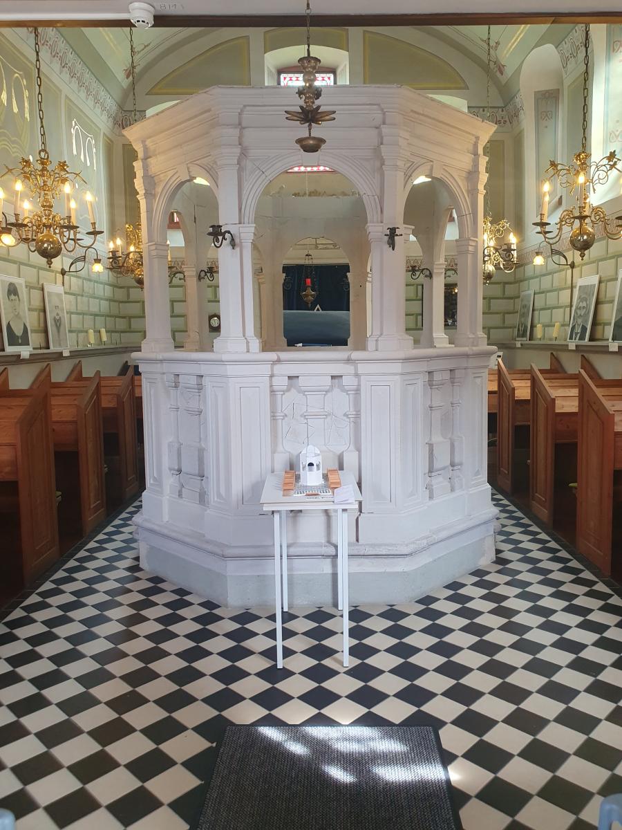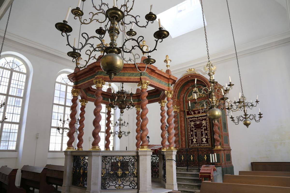 Im Zentrum des Betsaals steht eine erhöhte Plattform (Bima) für feierliche Lesungen aus der Tora. Traditionell gab es jedoch keine Sitzbänke oder Stühle, sondern individuelle Stehpulte. Regelmäßig wurden sie vom Laienvorsteher (Gabbai) neu versteigert, das Geld kam in die Gemeindekasse. In der orthodoxen Liturgie beten jüdische Männer an ihrem Pult in einem rythmischen Gesang, der von einem Vorsänger (Chasan, auch Kantor) geleitet wird.
