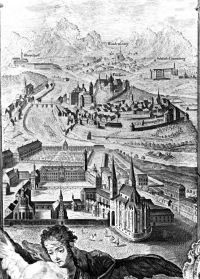 Ausblick auf die hochstiftischen Gebäude und Ländereien. Im Vordergrund ist der Augsburger Dombezirk, im Zentrum sind Stadt und Schloss von Füssen zu sehen.