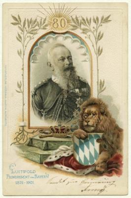 Brustbildnis des achtzigjährigen Prinzregenten Luitpold in Uniform. Rechts davor: Königsinsignien, Wappenschild und Löwe, Postkarte/Lithografie, 1901, Augsburg, Haus der Bayerischen Geschichte.
