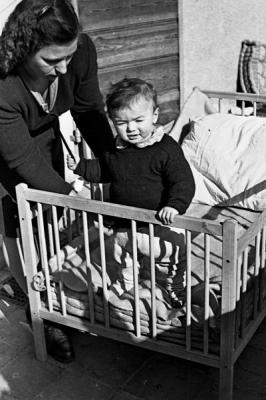 Alltagsleben in dem jüdischen Displaced-Persons-Lager (DP-Lager) Föhrenwald bei Wolfratshausen: Eine Mutter setzt ihr Kind in den Laufstall, Fotografie: 1946.