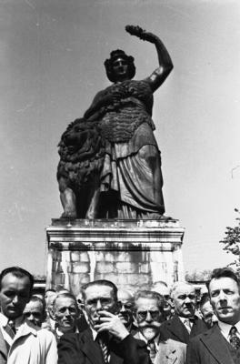 Gewerkschaftskundgebung vor der Bavaria auf der Münchner Theresienwiese, Fotografie: 1.5.1946.