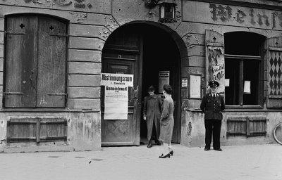 Gemeindewahlen in München: Außenaufnahme des Wahllokals im Weinhaus Neuner, Fotografie, 26. Mai 1946.