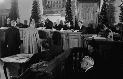 Der angeklagte Hausmeister der Münchner Ludwig-Maximilians-Universität vor der Spruchkammer München im Rahmen der Entnazifizierung, Fotografie, 15.6.1946.