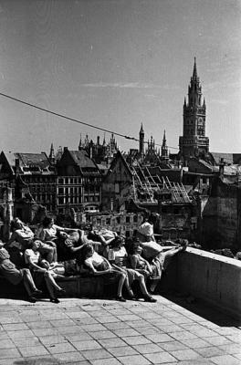 Junge Frauen nehmen ein Sonnenbad auf dem Dachgeschoss eines Hauses in der Theatinerstraße in München (im Hintergrund die kriegsgeschädigte Innenstadt mit Rathausturm), Fotografie, 1946.