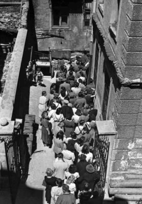 Warteschlange in einem Hinterhof vor der Ausgabestelle für Lebensmittelkarten in München, Fotografie: Juli 1946.