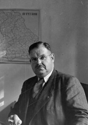 Pressekonferenz des Staatkommissariats für die Betreuung der Juden: Dr. Philipp Auerbach in seinem Büro, Fotografie: 17. September 1946.