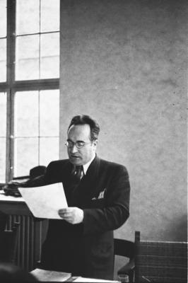 Staatsminister Dr. Josef Baumgartner bei einer Pressekonferenz im Ministerium für Landwirtschaft in München, Fotografie, 16.11.1946.