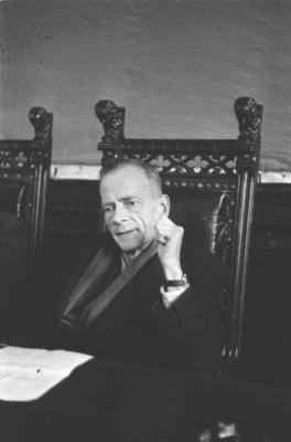 Der SPD Parteivorsitzende Dr. Kurt Schumacher (1895-1952) im Rathaussaal in München nach der SPD Wahlkundgebung auf dem Münchner Königsplatz, Fotografie: 24.11.1946.
