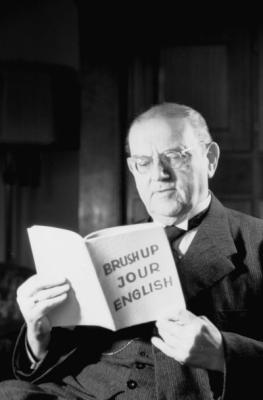 Der Münchner Oberbürgermeister Dr. Karl Scharnagl (17.1.1881-6.4.1963) vertieft seine Englischkenntnisse mit dem Buch 'BRUSH UP JOUR ENGLISH', Fotografie: Januar 1947.
