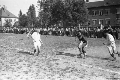 Fußballspiel in Gabersee in Wasserburg am Inn (der Platz liegt vermutlich auf dem heutigen Bezirksklinikum Gabersee), Fotografie: 31.5.1947.