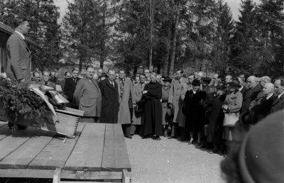 Gedenkveranstaltung im ehemaligen Konzentrationslager Dachau: Bei einer Ansprache vor dem ehemaligen Neuen Krematorium steht Dr. Philipp Auerbach (hinter dem Podest) zwischen den Gästen, Fotografie: 2. April 1946.