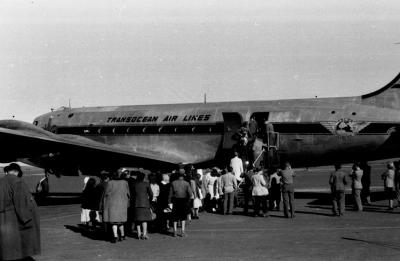Passagiere besteigen ein Flugzeug der 'Transocean Air Lines' auf dem Flughafen München Riem, Fotografie, Mai 1948.
