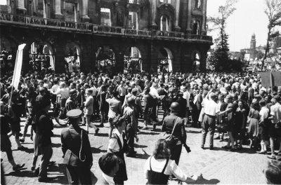 Hungerdemonstration der Münchner Studenten: Demonstrationszug in der Galeriestraße am Hofgarten; im Hintergrund die Theatinerkirche, Fotografie, 17. Juni 1948.