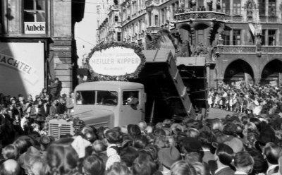 Lastkraftwagen der Firma Meiller-Kipper im Blumenkorso der Münchner Künstlerhilfe zugunsten der Stadt Berlin (Ort: Münchner Marienplatz, rechts das Neue Rathaus), Fotografie: 3.10.1948.