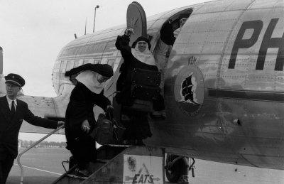 Benediktinerinnen aus Tutzing beim Abflug in die Mission nach Brasilien am Flughafen München-Riem, Fotografie, Oktober 1948.
