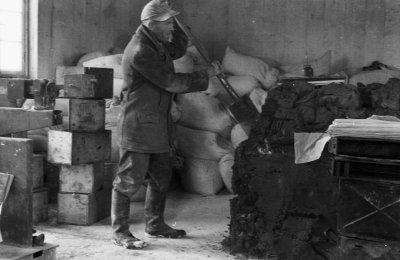 Blick in eine Münchner Kittfabrik in der Neumarkterstr. 37 (Arbeiter sticht mit einer Schaufel das Rohmaterial an), Fotografie: März 1949.