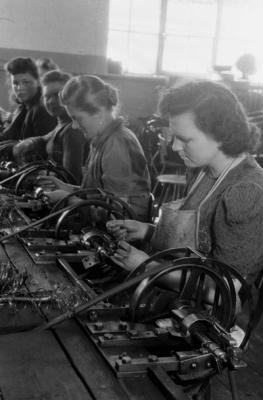 Frauen bei der Herstellung von Metallfedern in der Münchner Matratzenfabrik Schlaraffia, Fotografie, April 1949.