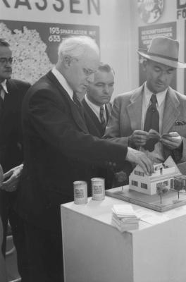Wirtschaftsminister Dr. Rudolf Zorn (links) als geschäftsführender Direktor des bayerischen Sparkassen- und Giroverbandes auf der Münchner Handwerksmesse, Fotografie: Juli 1949.