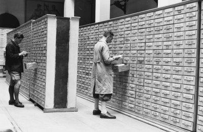 Zwei Männer an den Karteikästen der Landesversicherungsanstalt Oberbayern in München, Fotografie: August 1949.