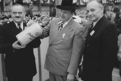 Landwirtschaftsminister Schlögl, Gouverneur van Wagoner und Ministerpräsident Ehard bei der Eröffnung des Zentral-Landwirtschaftsfests in München, Fotografie: 17.9.1949.